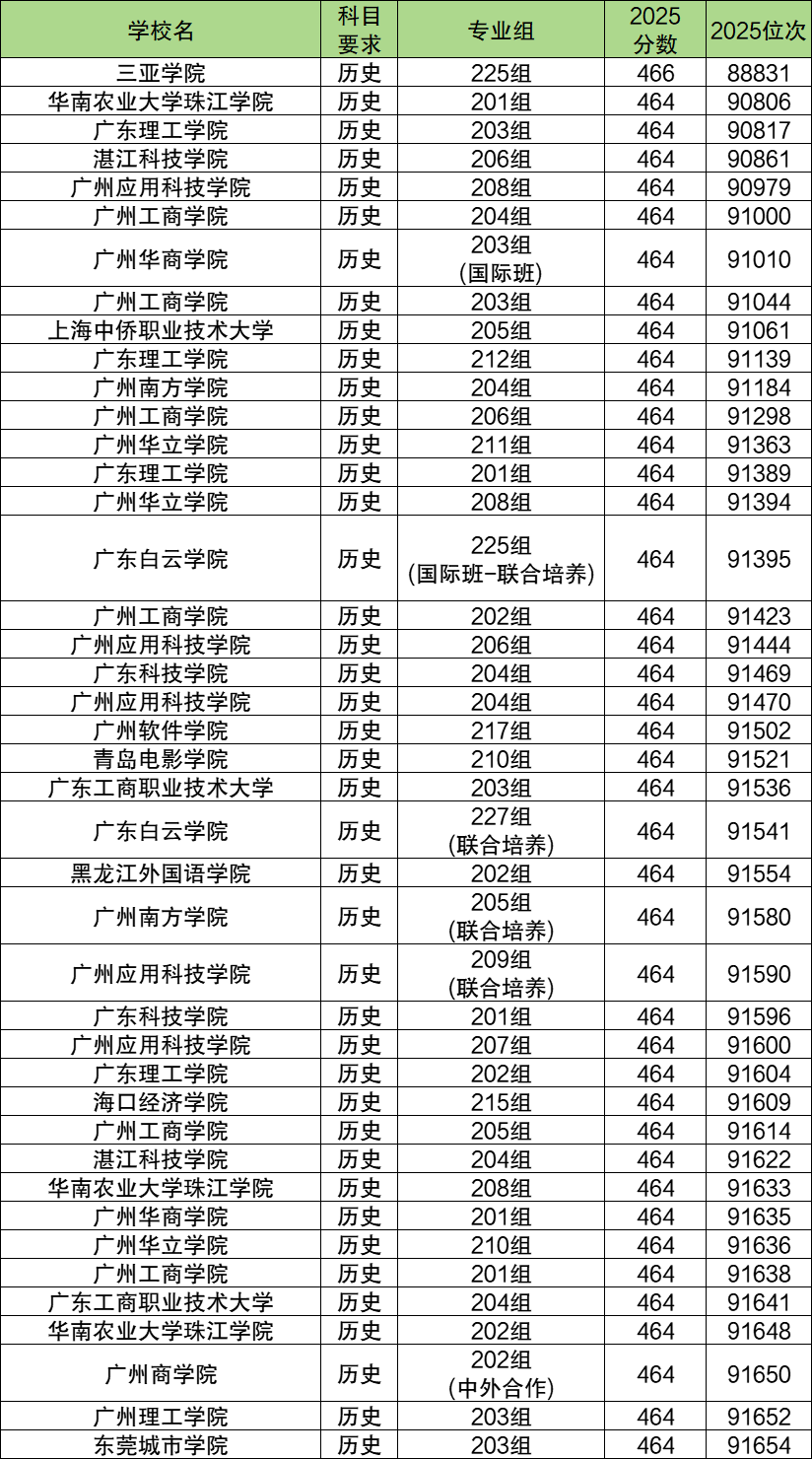 2025年广东历史类本科批分数线附近(464分到466分)能上的本科院校一共有20个,排名靠前的有三亚学院(225组,88831名)、华南农业大学珠江学院(201组,90806名)、广东理工学院(203组,90817名)等,这些属于本科批分数线附近考生可以冲一冲的学校。