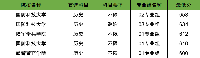 2025江苏军校录取分数线公布,军校历史类录取分数线最高的是国防科技大学02专业组(不限),2025年投档最低分658分;录取分数线最低的是武警警官学院01专业组(不限),2025年投档最低分600分。