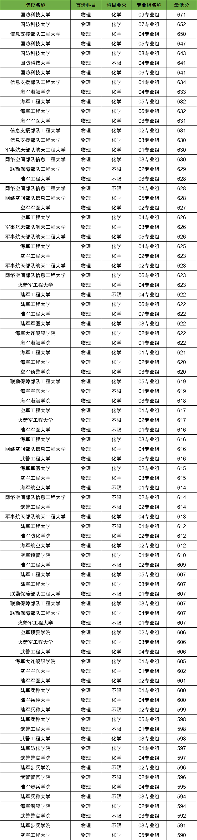 军校物理类录取分数线最高的是国防科技大学09专业组(化学),2025年投档最低分671分;录取分数线最低的是空军工程大学05专业组(化学),2025年投档最低分为590分。