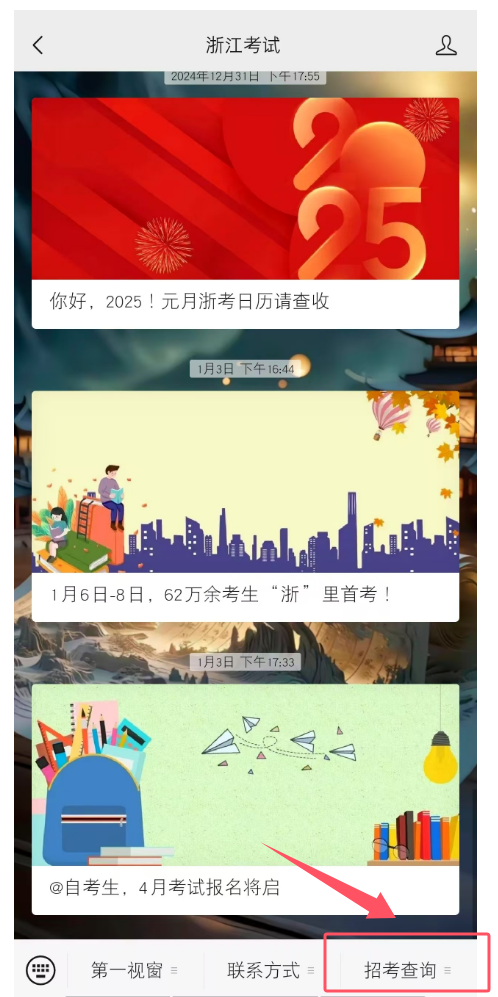 3、微信公众号:考生还可以关注“浙江考试”微信公众号,进入后点击“招考查询”,在“2025.1选考学考”的查询字样下输入相关信息进行查询。