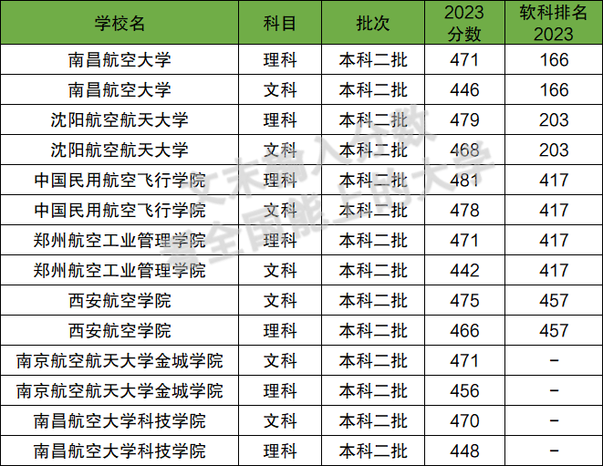 2023年在文科二本中招生的航空大学有7所,以南昌航空大学全国排名最好,排在第166名。以中国民用航空飞行学院分数最高,起码要在478分以上。