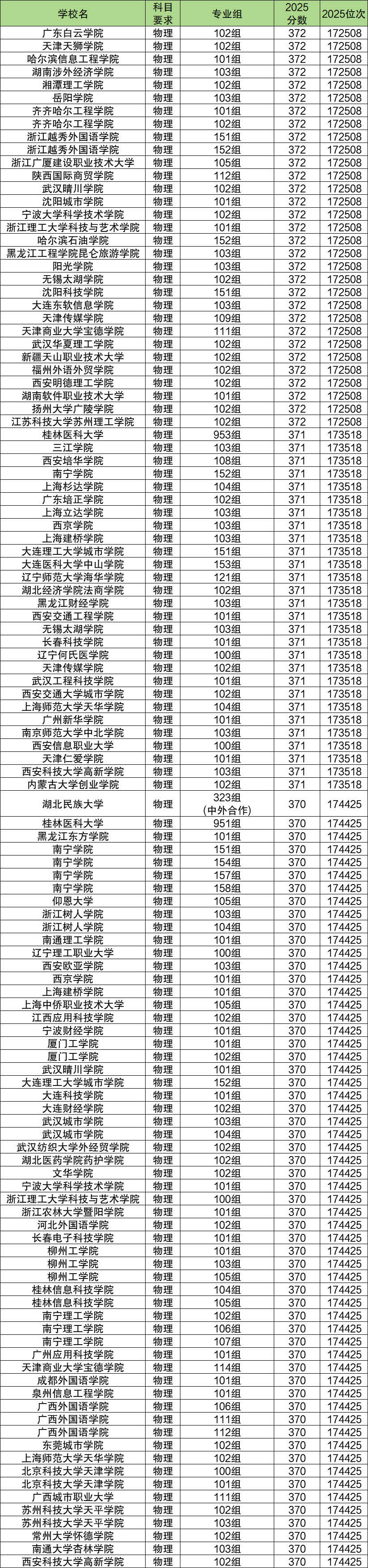 2025年广西物理类本科批分数线附近(370分到372分)能上的本科院校一共有88个,排名靠前的有广东白云学院(102组,172508名)、天津天狮学院(102组,172508名)、哈尔滨信息工程学院(101组,172508名)等,这些属于本科批分数线附近考生可以冲一冲的学校。