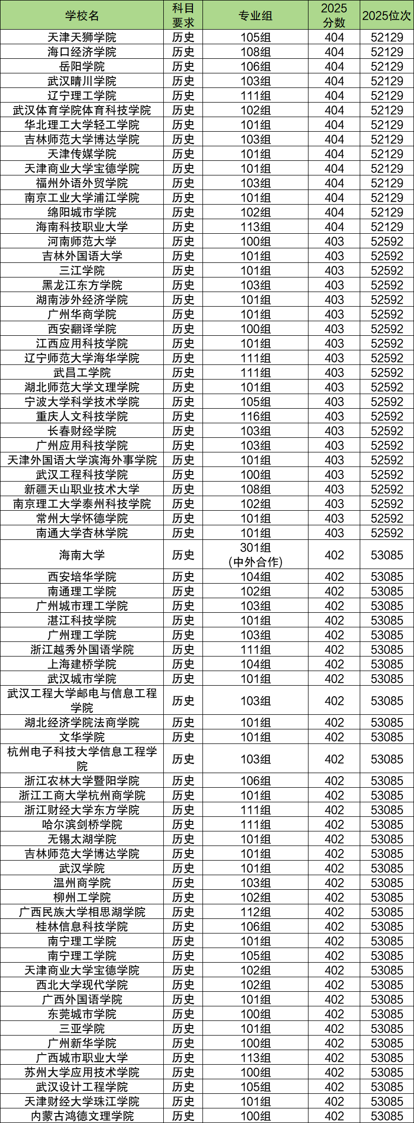 2025年广西历史类本科批分数线附近(402分到404分)能上的本科院校一共有69个,排名靠前的有天津天狮学院(105组,52129名)、海口经济学院(108组,52129名)、岳阳学院(106组,52129名)等,这些属于本科批分数线附近考生可以冲一冲的学校。
