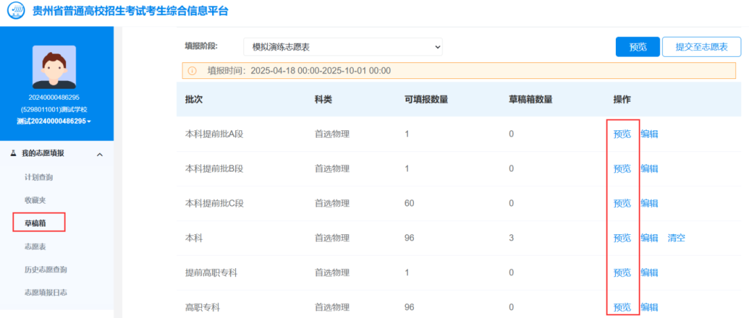各批次志愿填报完成后,点击页面下方的【保存草稿】项,然后预览各批次志愿表,确认信息填报无误。核对完后,考生再点击右上角的【提交至志愿表】,输入登录密码点击【确认】即可提交成功。