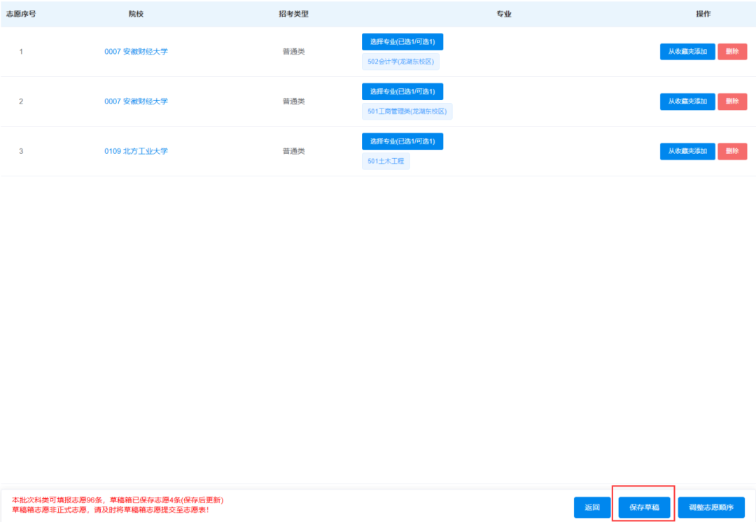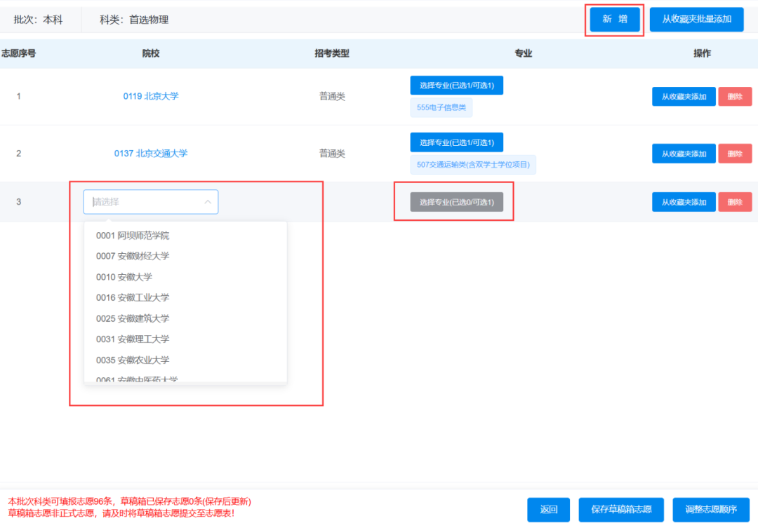 点击【我的志愿填报】面板下的【草稿箱】,在页面中选择要填报的批次,点击右侧的【编辑】就可以开始填报志愿。点击【新增】,可以逐条添加院校及专业。注意查看核对代码正确性。