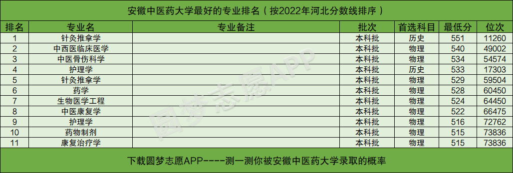 友情提醒:下载圆梦志愿APP,可查阅安徽中医药大学在你的高考省份各专业的录取分数线、位次排名。(各大手机应用市场均可下载圆梦志愿APP)