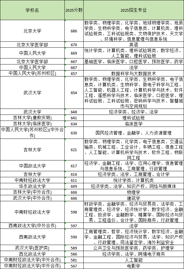 分数线最高的是北京大学的数学类、物理学类等专业,2025年最低分686分;五院四系分数线排名前十的还有: