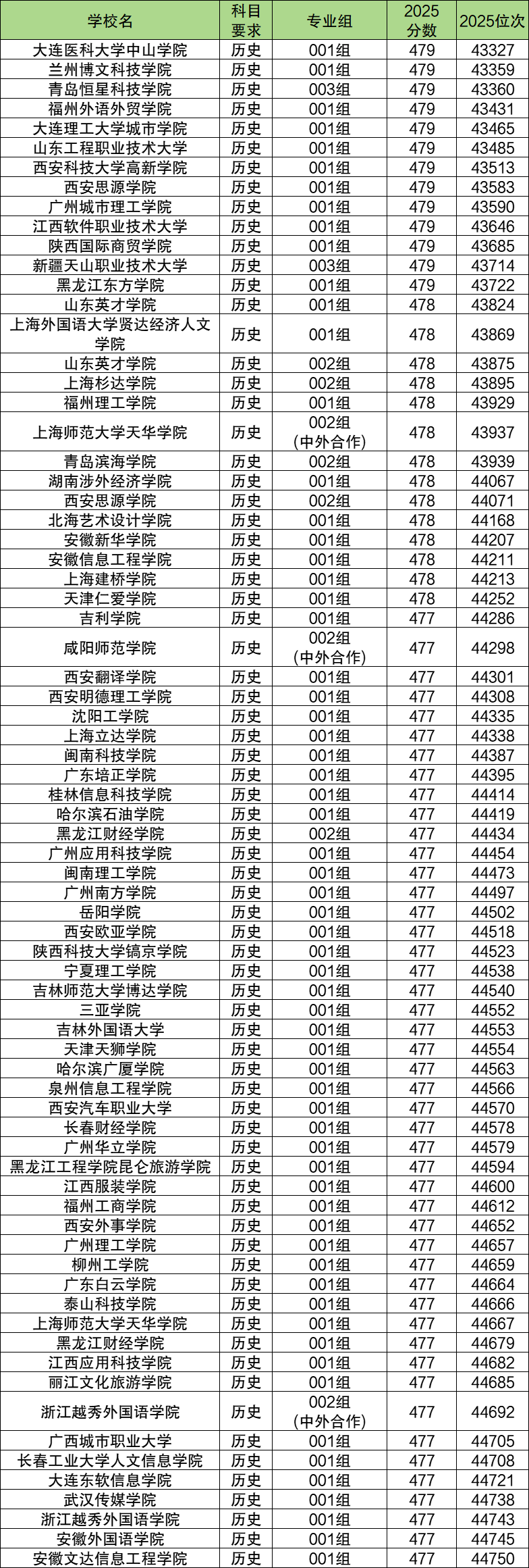历史类:本科批分数线为477分,对应位次是44750名。