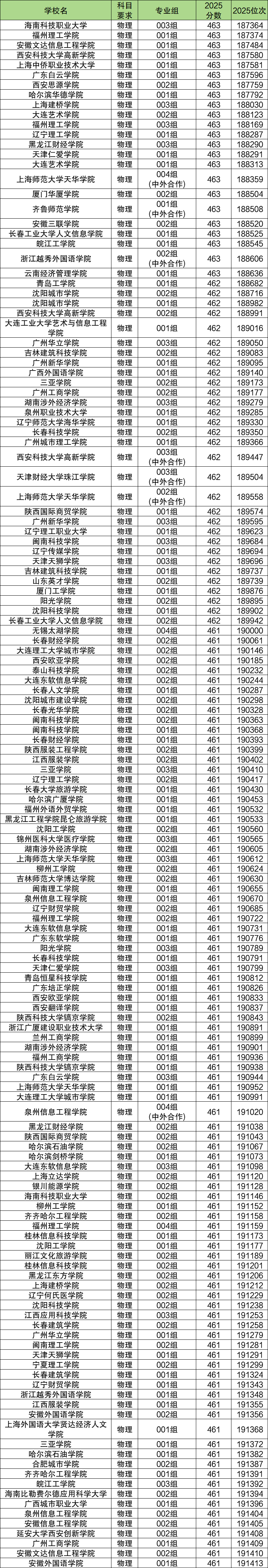 2025年安徽物理类本科批分数线附近(461分到463分)能上的本科院校一共有94个,排名靠前的有海南科技职业大学(第003组,187364名)、福州理工学院(第001组,187374名)、安徽文达信息工程学院(第001组,187484名)等,这些属于本科批分数线附近考生可以冲一冲的学校。
