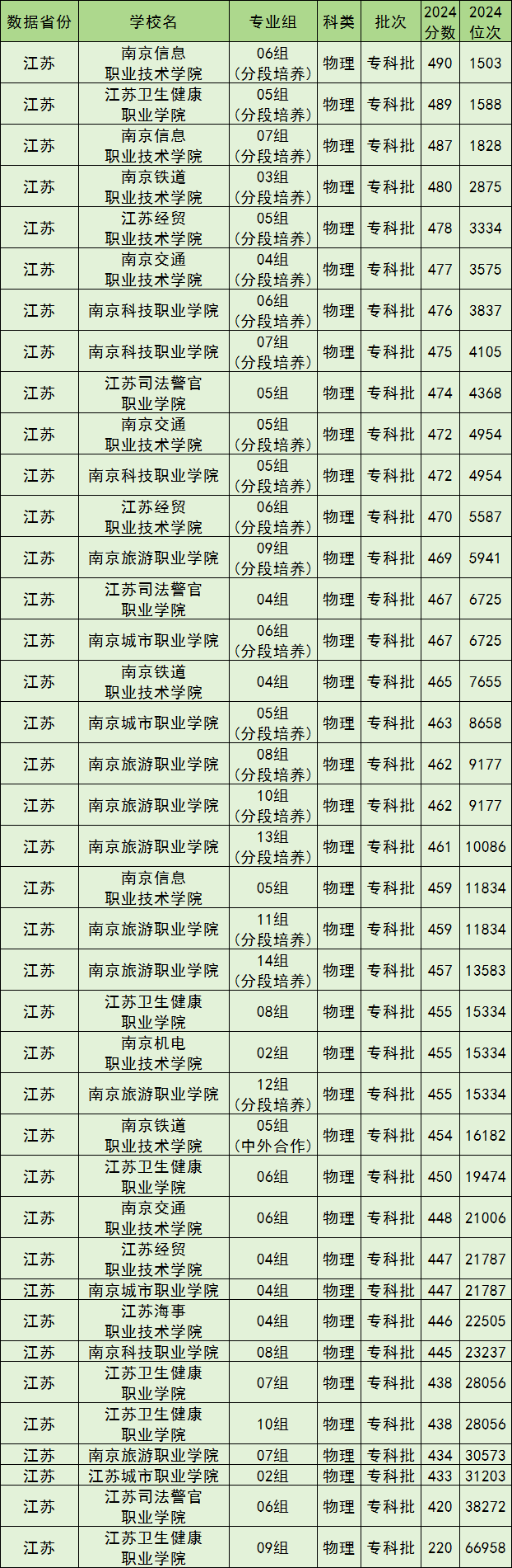 下面是2024年南京市公办大专院校分数线排名物理类一览表: