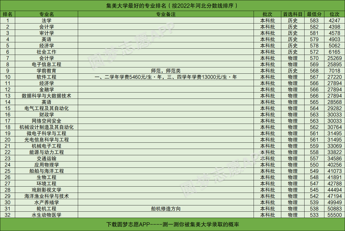 由于福建省教育考试院目前还未公布2022年的专业分,所以本文将以集美大学在河北2022年高考的录取情况为例,为大家展示集美大学最好的专业排名。