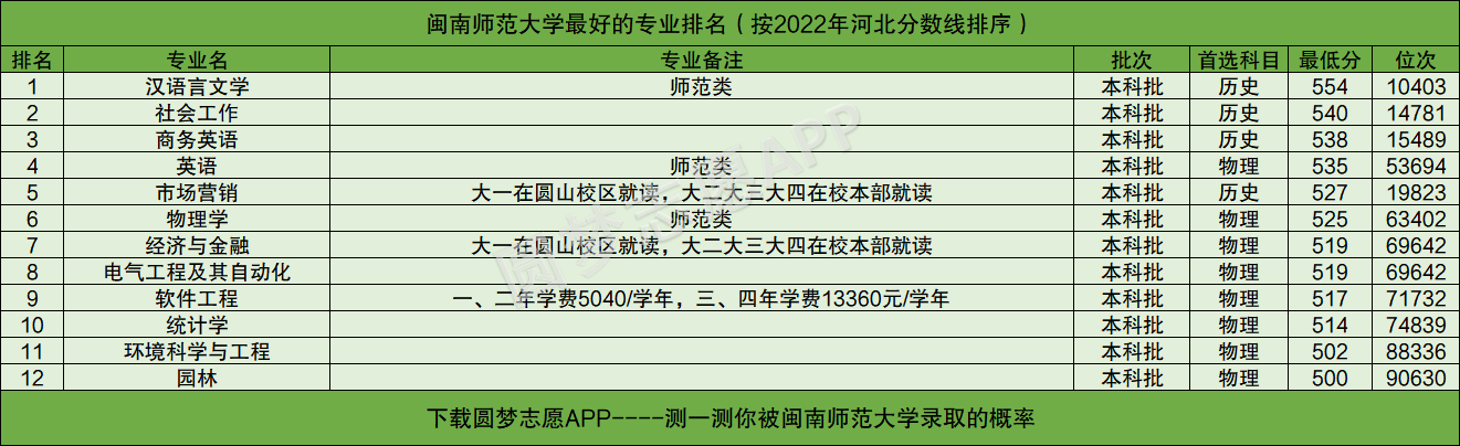 由于福建省教育考试院目前还未公布2022年的专业分,所以本文将以闽南师范大学在河北2022年高考的录取情况为例,为大家展示闽南师范大学最好的专业排名。