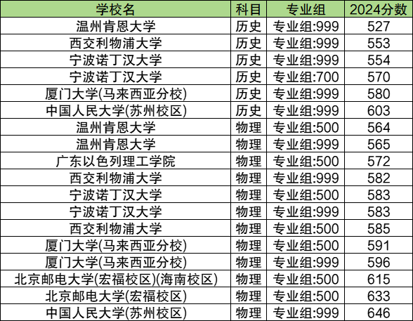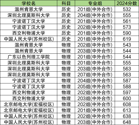 2024中外合作在历史类录取分数线527分-603分。最低录取分数线对应院校:温州肯恩大学999组;最高录取分数线对应院校:中国人民大学(苏州校区)999组。