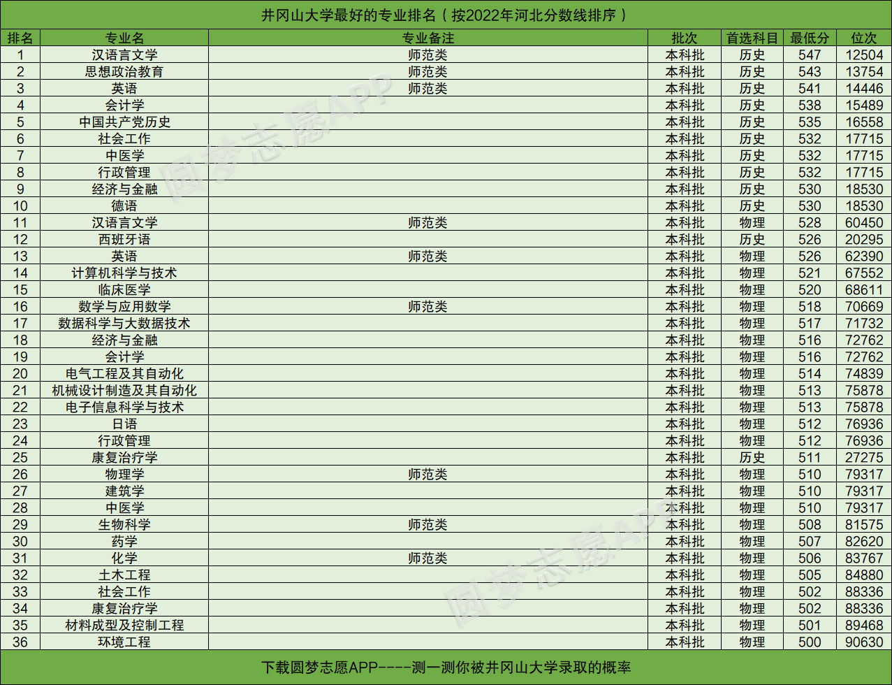 由于江西省教育考试院目前还未公布2022年的专业分,所以本文将以井冈山大学在河北2022年高考的录取情况为例,为大家展示井冈山大学最好的专业排名。