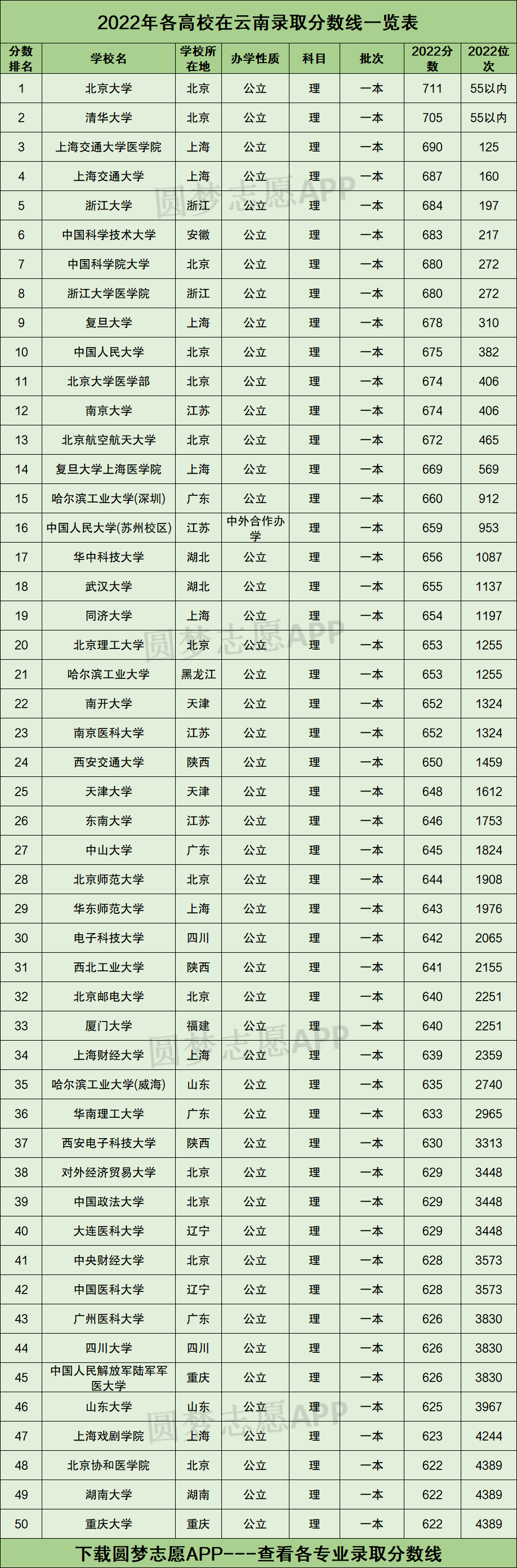 对于不想留在云南省读大学的高三同学来说,全国各地的高校在云南省的录取分数线则才是一份最有价值的参考资料。不过本文由于篇幅有限,将仅为大家展示2022年各高校在云南录取分数线最高的前50所大学,如果你想查看全国近3000所大学在云南省的录取分数线排名,可以在圆梦志愿APP中直接下载EXCEL表格。