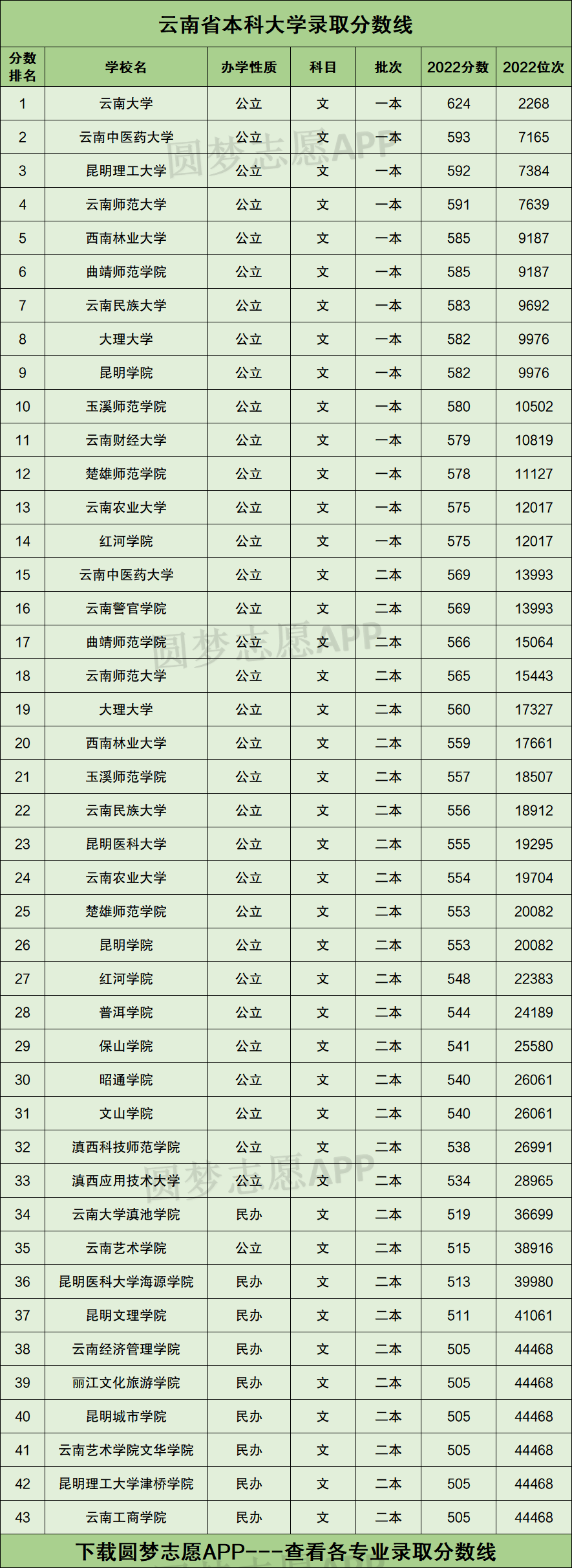 根据云南省考试院公布的数据,圆梦志愿按照文科分数线的高低排序,为大家整理出了下图这份云南省内的所有本科大学文科录取分数线排名榜单: