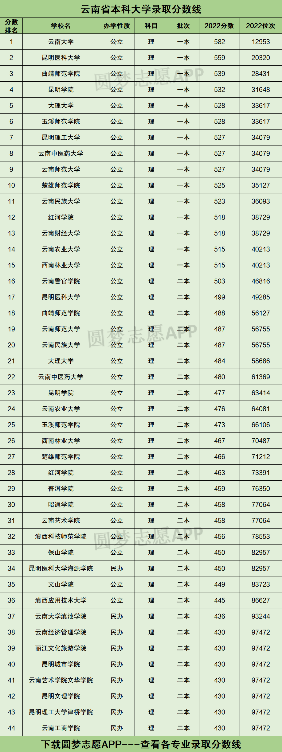 圆梦志愿根据考试院的数据,为大家整理了云南省内所有本科大学2022年高考理科的分数线及位次排名。具体见下图: