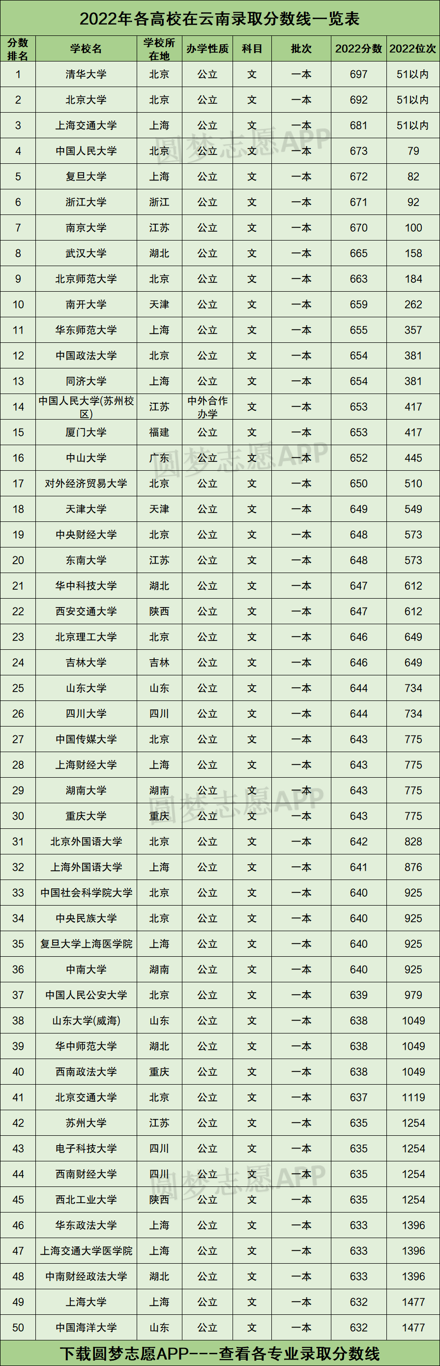 根据上图可知,2022年云南高三文科考生,只有成绩考到了632分以上、在全省文科考生中排名前1477名,才有机会被全国50强大学录取!