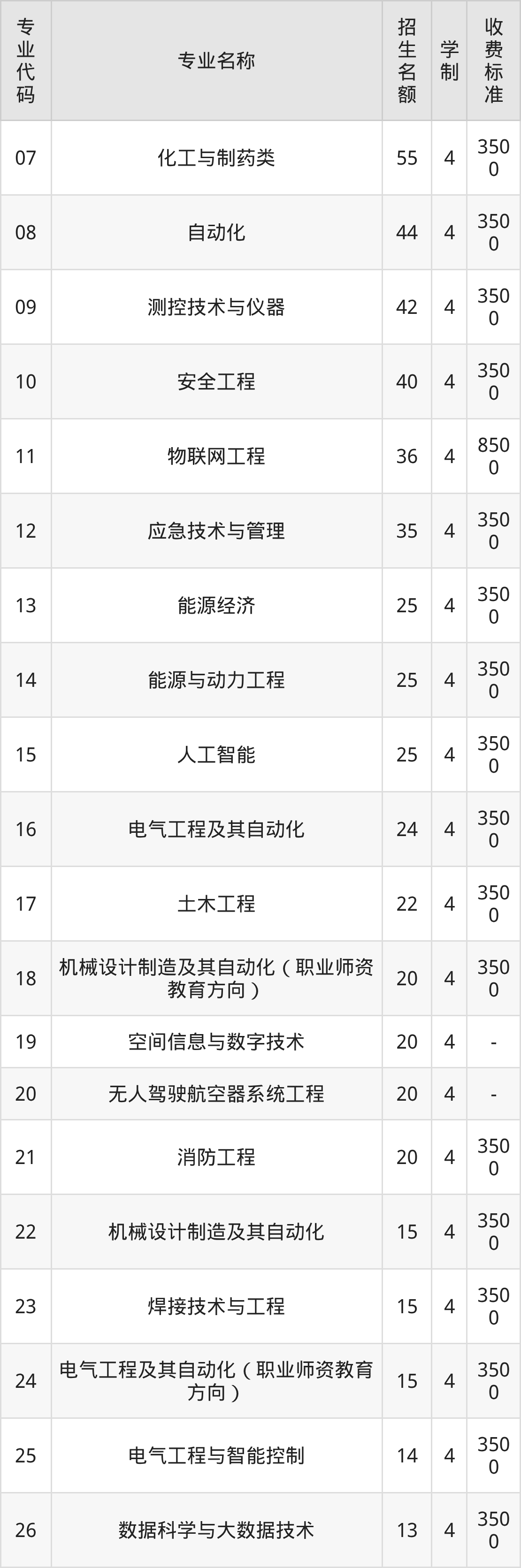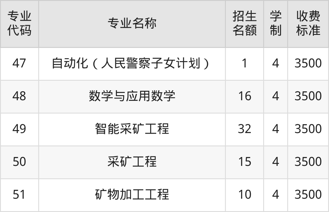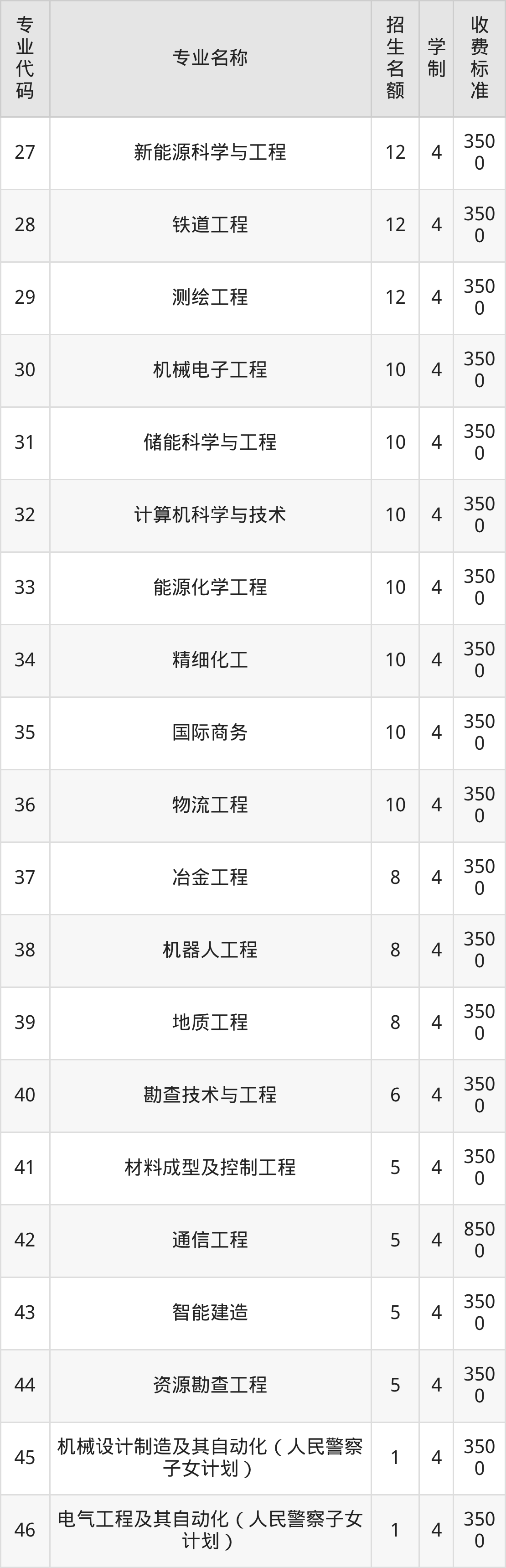 | 专业 代码 | 专业名称 | 招生 名额 | 学 制 | 收费 标准 |