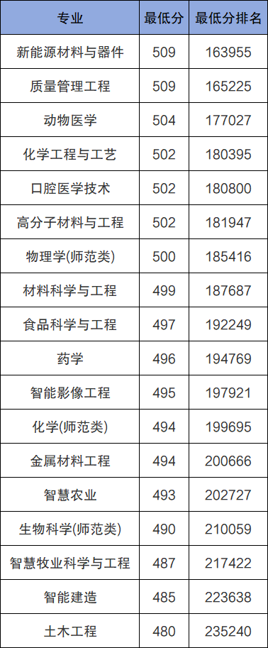 2025年地方专项计划最低480分,位次235240名。各专业分数线一览表如下: