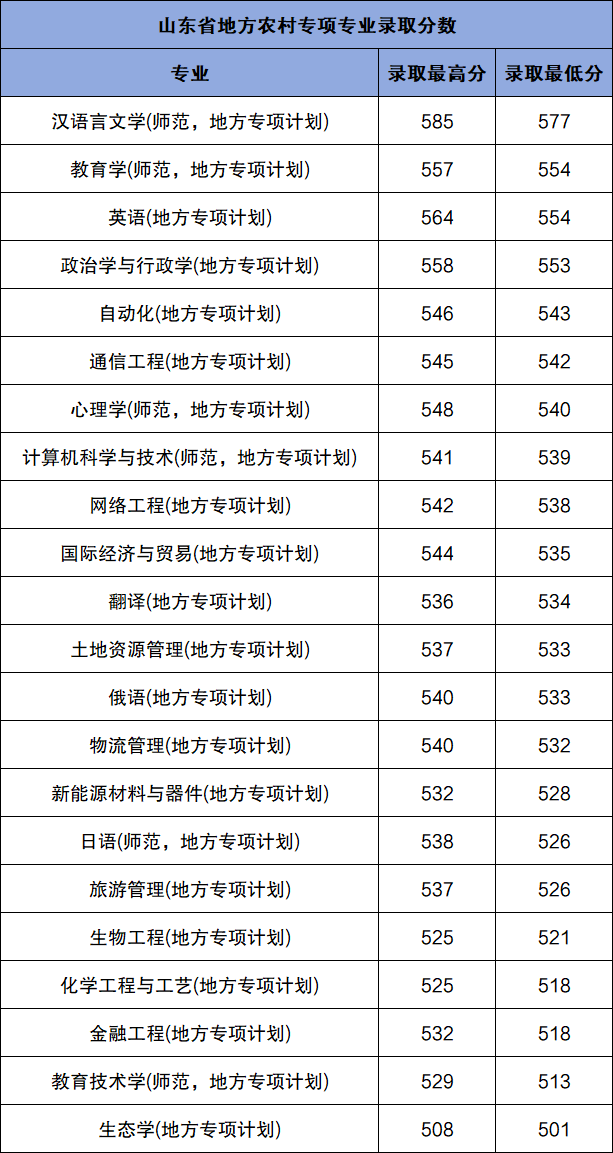 山东地方专项计划招生学校有山东科技大学、山东理工大学、山东师范大学、曲阜师范大学、山东财经大学、青岛大学、山东第一医科大学等。2025年山东地方专项计划录取分数线:山东农业大学500~522分,各个学校专业分数线详情如下。