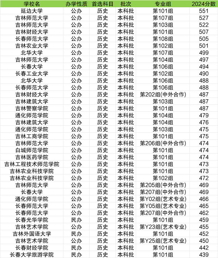 分数线排名前五的院校是延边大学(551分)、吉林师范大学(527分)、吉林师范大学(522分)、吉林财经大学(507分)、长春师范大学(505分)。