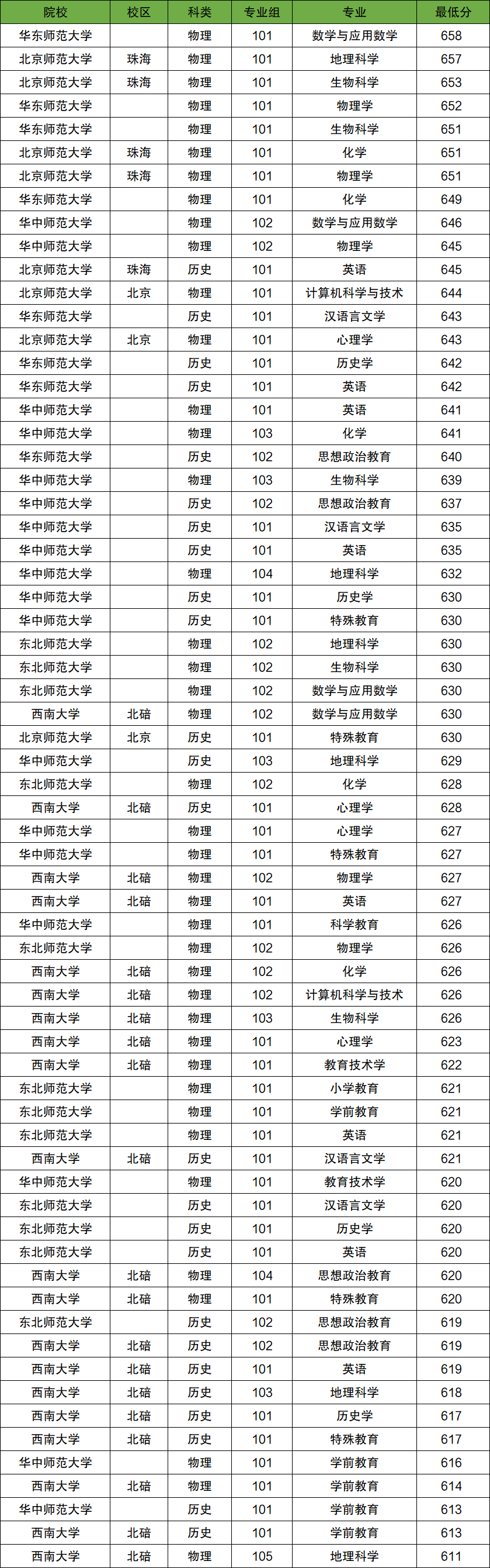 最高分的公费师范生院校及专业是北京师范大学(珠海校区)的英语专业,录取分数线为645分。