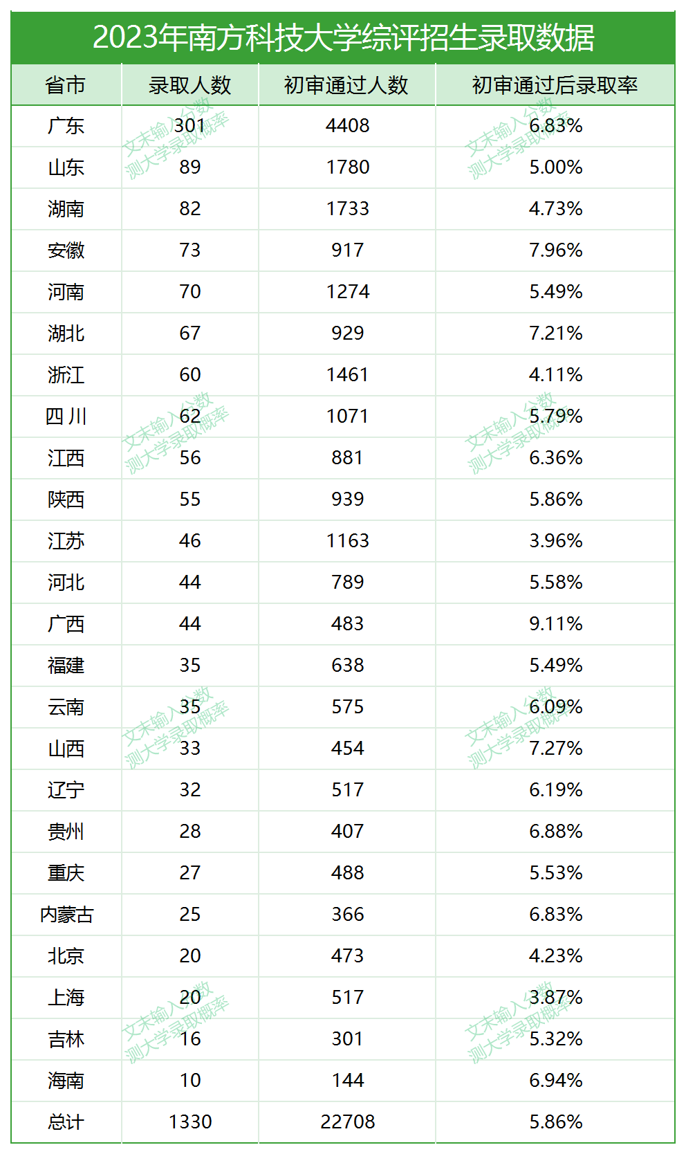 2023年南方科技大学综合评价招生录取了1330名新生,相较于2022年增加了大约5000人。其中,广东省的考生数量最多,达到了301人。此外,山东省有89人被录取,湖南省有82人,安徽省有73人等等。