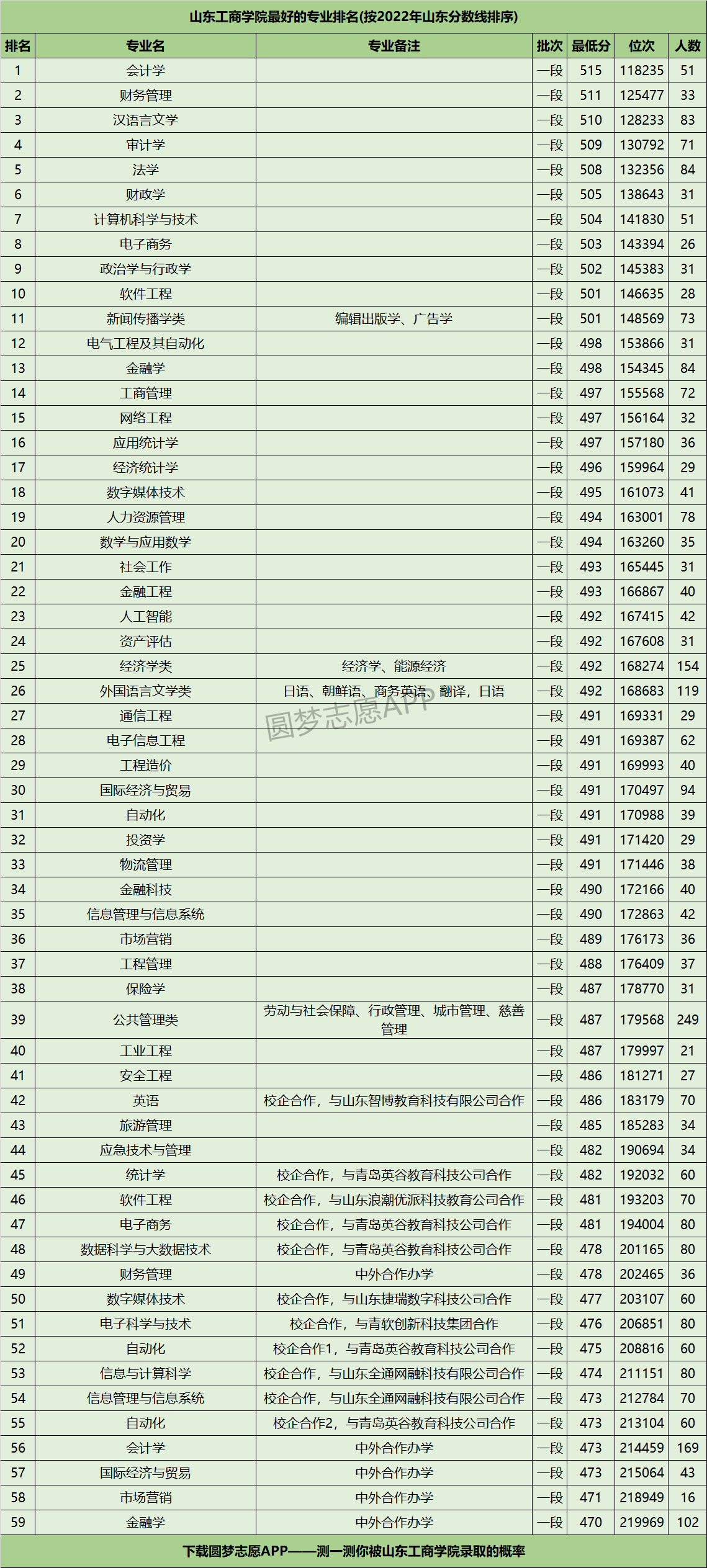 友情提醒:下载圆梦志愿APP,可查阅山东工商学院在你的高考省份各专业的录取分数线、位次排名。(各大手机应用市场均可下载圆梦志愿APP)