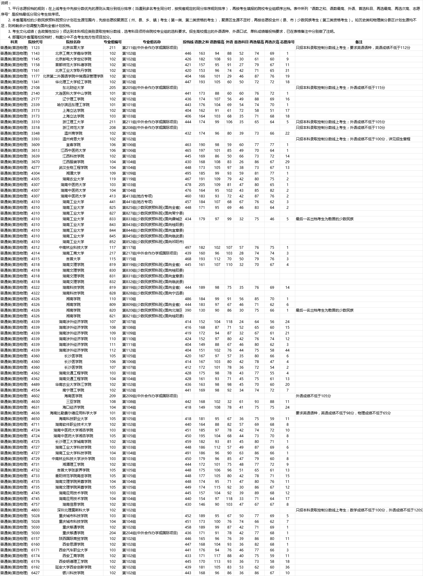 湖南本科批第一次征集志愿全国学校名单及分数线如下图