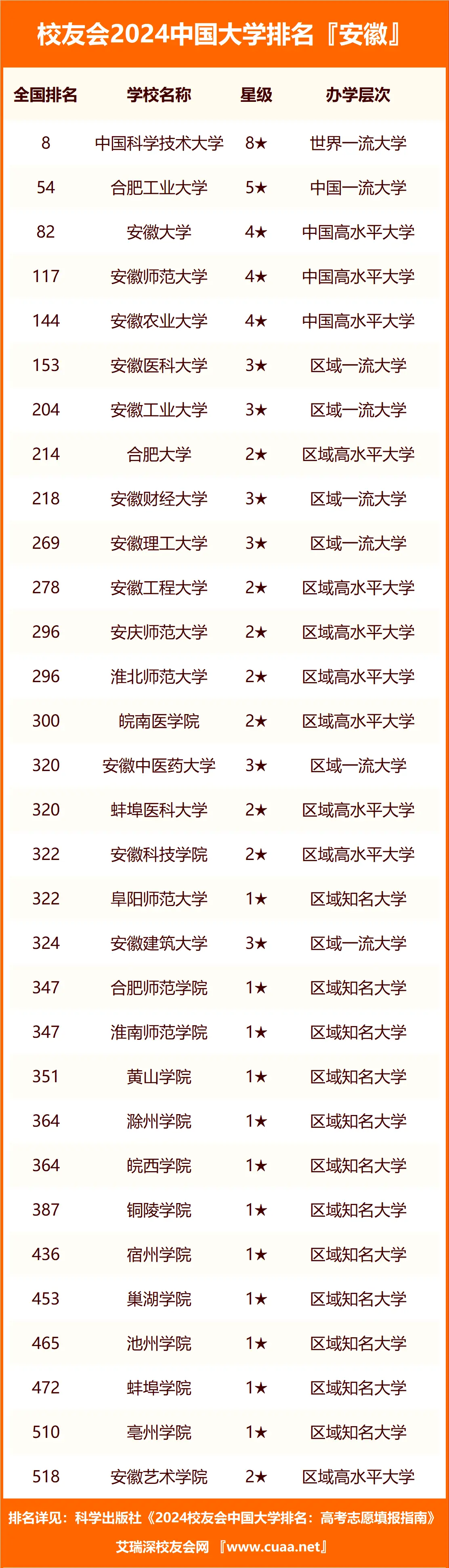 以下为2024年校友会安徽省公办本科大学排名,各位安徽省的同学和家长可作为参考。