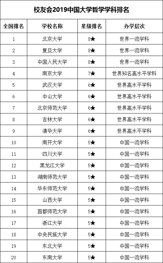 小编整理了校友会2019年哲学学科全国排名前20的大学,供大家选择参考。