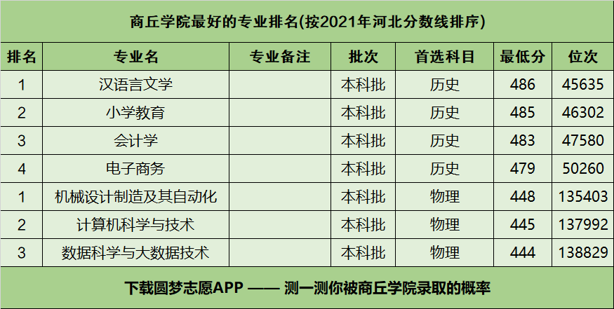 由于河南省招生办公室目前还未公布2021年的专业分,所以本文将以商丘学院在河北2021年高考的录取情况为例,为大家展示商丘学院最好的专业排名。