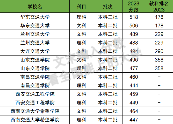 2023年在文科二本中招生的交通大学有7所,以华东交通大学全国排名最好,排在第178名。以华东交通大学分数最高,起码要在506分以上。