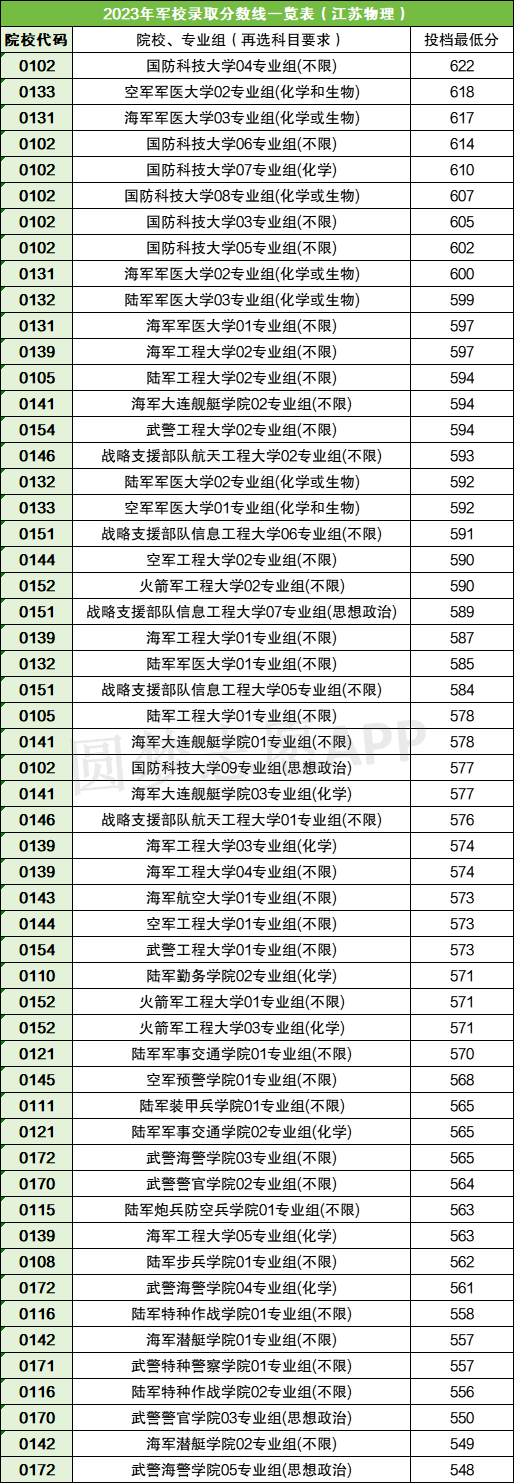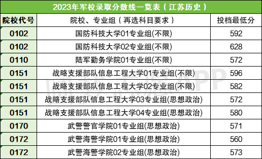 以军校在物理类的录取情况为例,其中国防科技大学的最低分为638,陆军工程大学的最低分为602,陆军步兵学院的最低分为585。关于军校各专业组在江苏物理类和历史类完整的分数线,本文都进行了整理,供查阅。