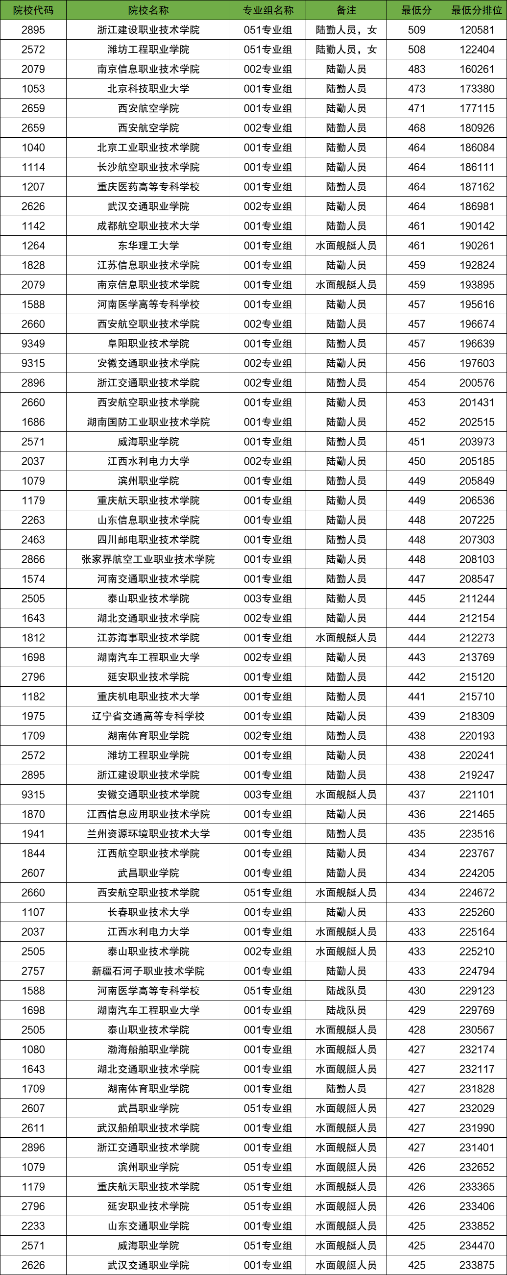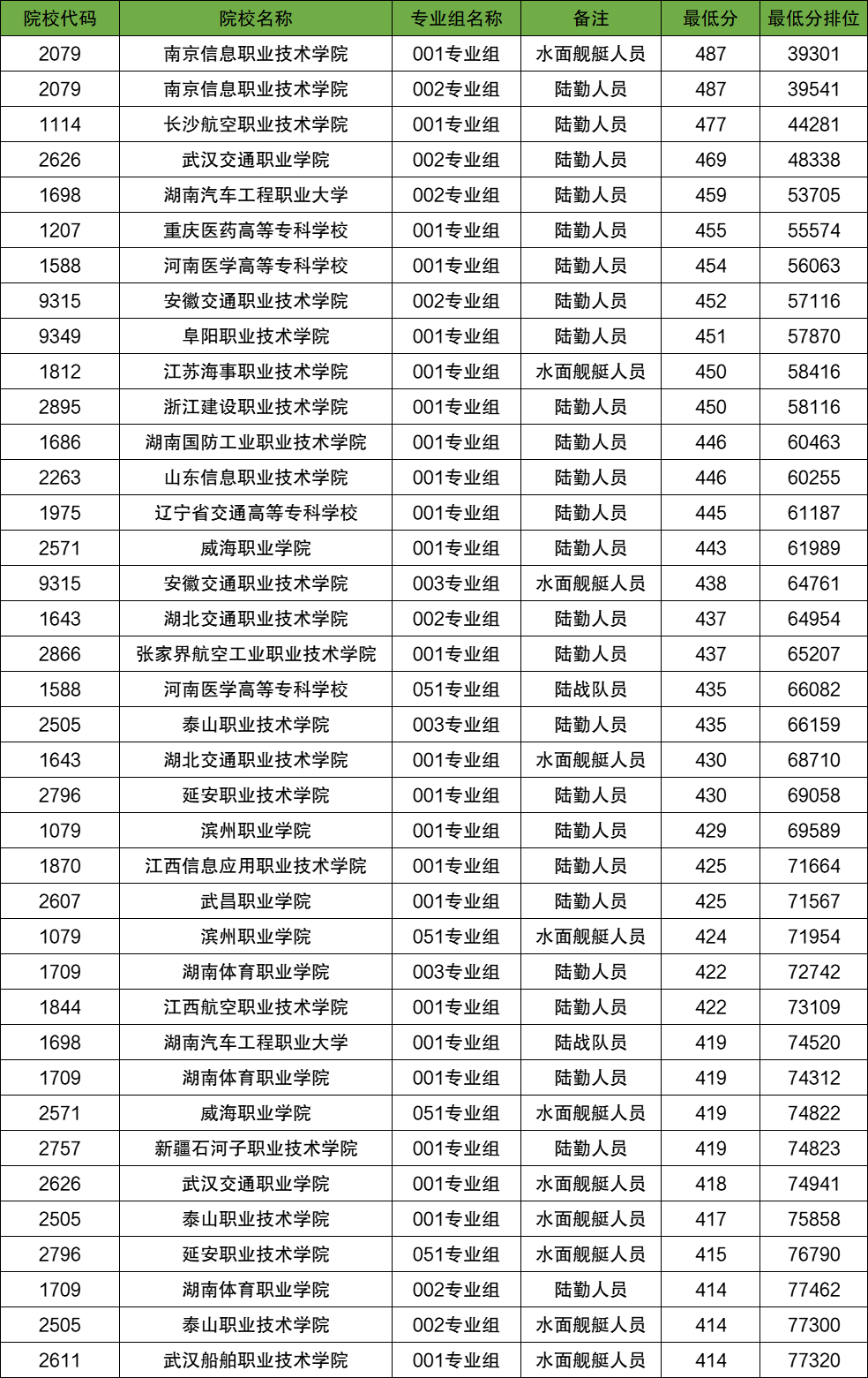 分数线较低的定向培养军士学校还有泰山职业技术学院(414分)、湖南体育职业学院(414分)、延安职业技术学院(415分)、武汉交通职业学院(418分)等。
