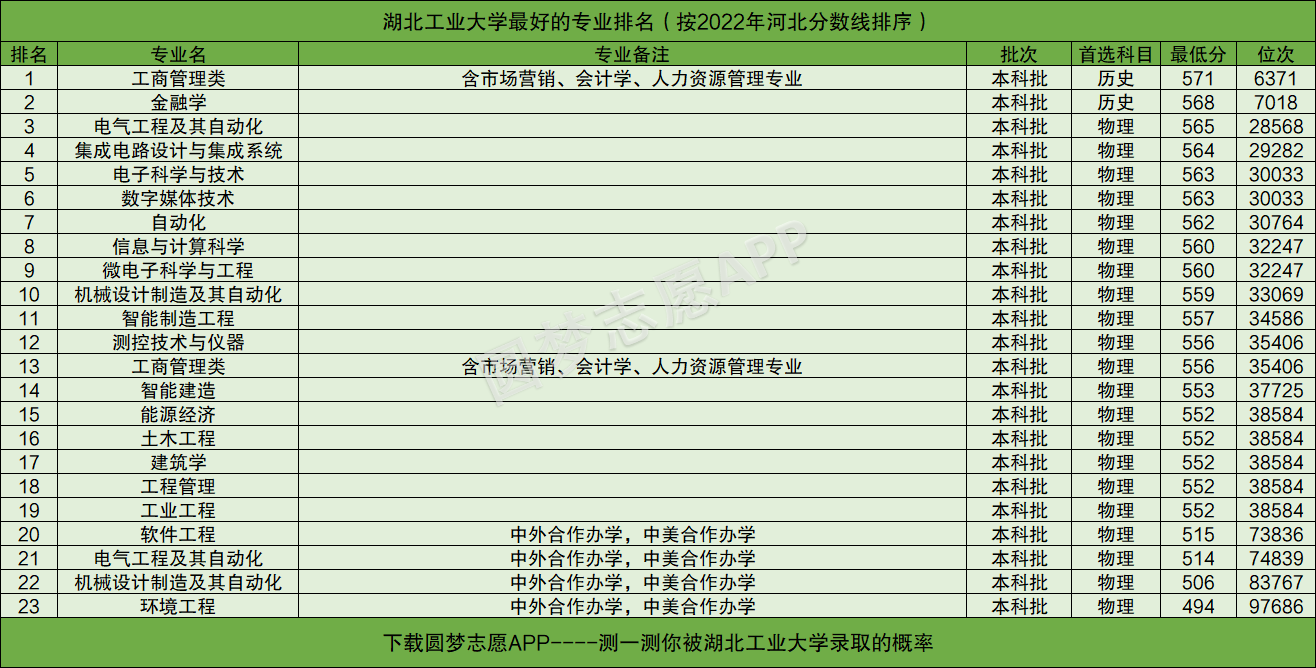 由于湖北省教育考试院目前还未公布2022年的专业分,所以本文将以湖北工业大学在河北2022年高考的录取情况为例,为大家展示湖北工业大学最好的专业排名。