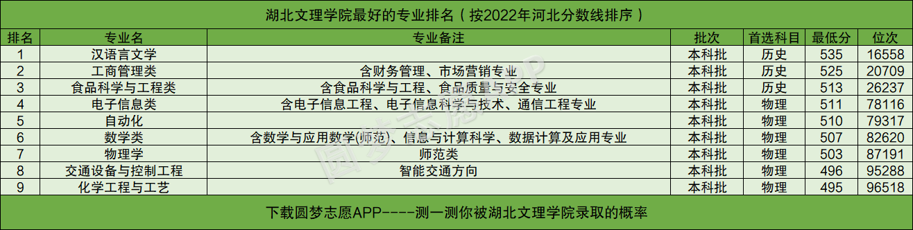 由于湖北省教育考试院目前还未公布2022年的专业分,所以本文将以湖北文理学院在河北2022年高考的录取情况为例,为大家展示湖北文理学院最好的专业排名。