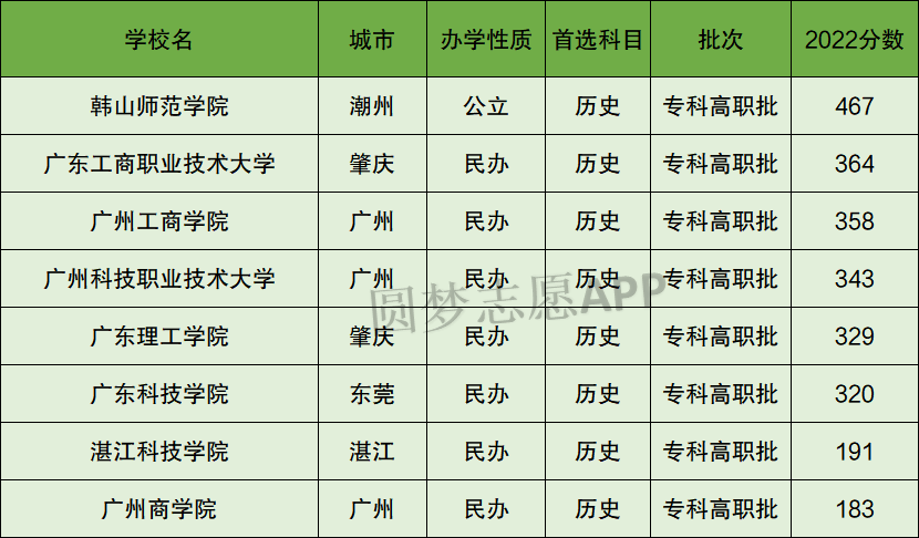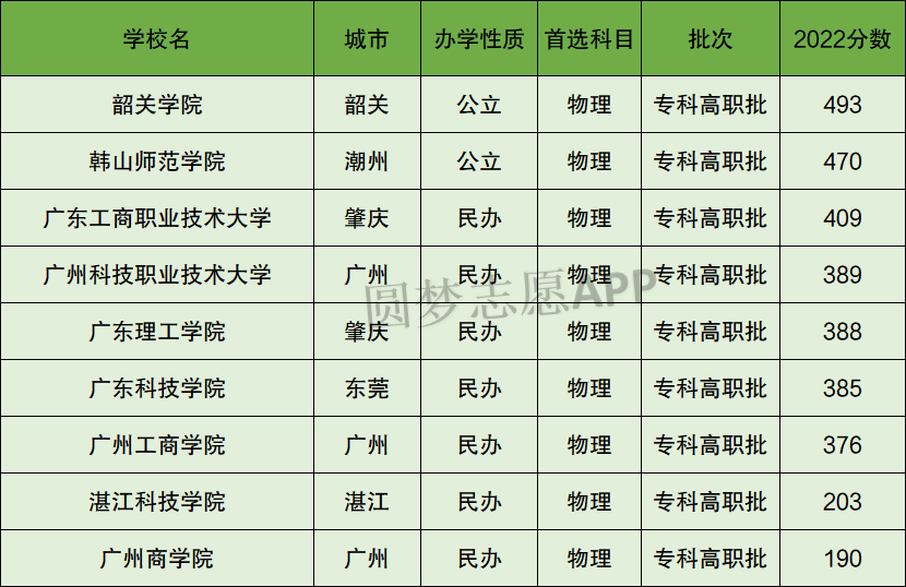 2022年在广东省物理类专科最低分数为470分,历史类专科最低分为467分。