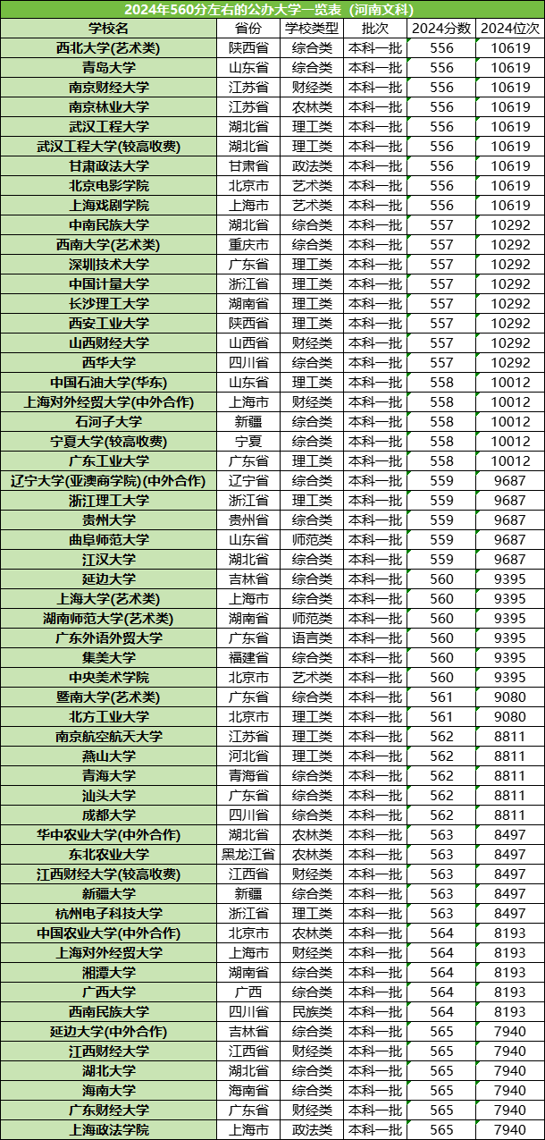 560分左右能上的院校有56所,基本属于实力普通的一本大学。