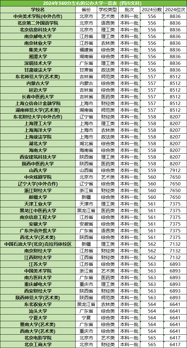 以四川2024年的招生数据为例,在理科方面,560分左右的院校有广东医药大学、湖南师范大学、江苏科技大学、华东政法大学、石河子大学等。关于其余省市560分左右能上的院校,详见下文。