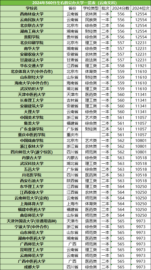 受分数线差异的影响,各省560分左右能上的院校都是有所不同的,小编在此以四川、河南、云南为例,整理了2024年这三个地区560分左右能上的院校名单,如下:
