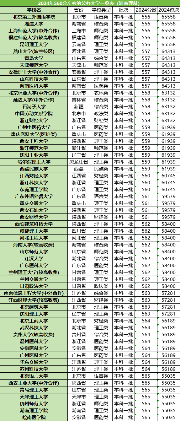 560分左右能上的院校有59所,基本属于实力普通的一本大学。