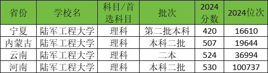2024年全国理科/物理类分数最低的二本军校分数范围在420分~530分之间,其中宁夏考生上二本军校的分数门槛最低,2024年理科考生420分即可报考陆军工程大学,而该分数对应在省排名位次为16610名。