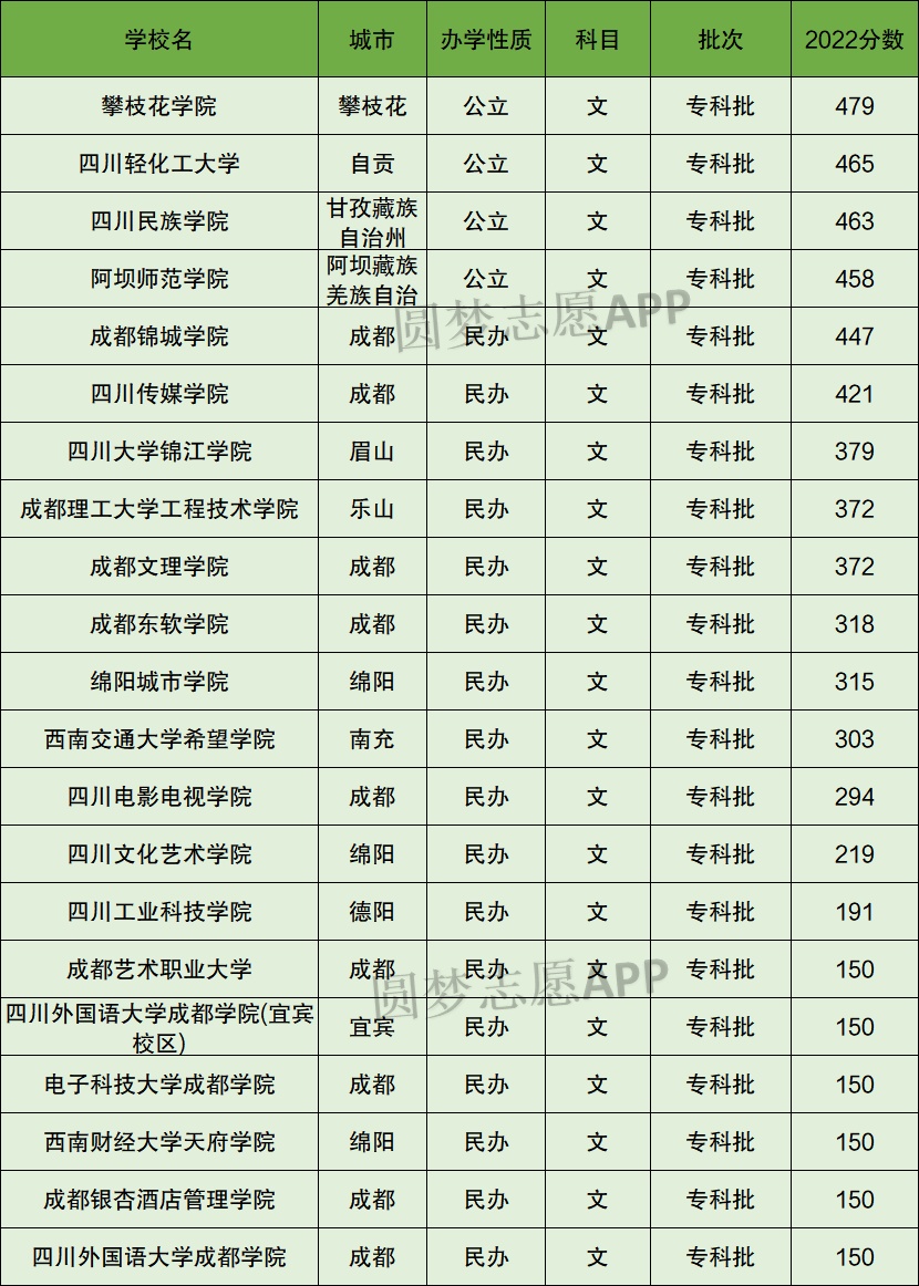 根据圆梦志愿APP查询数据,本文为大家整理了位于四川省内、且在专科批次有招生的本科大学名单,其中包含5所公办大学和17所民办大学。
