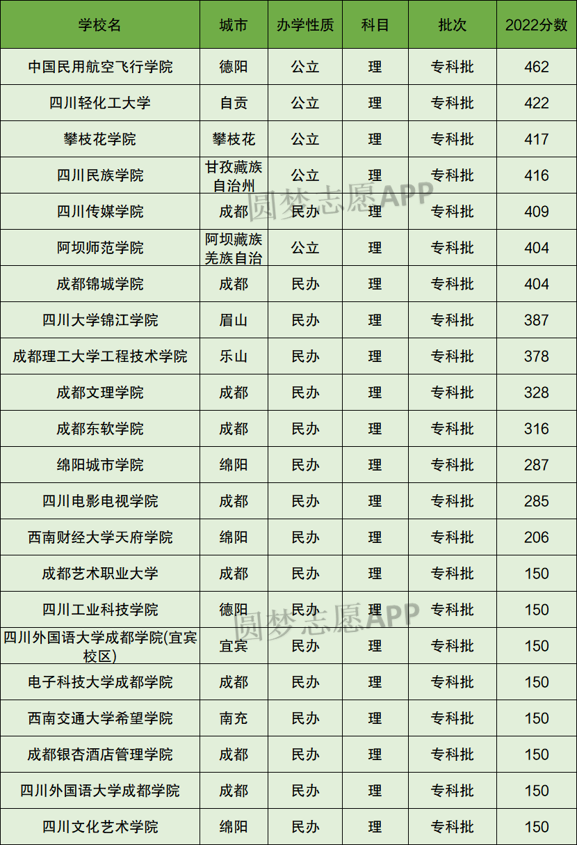 2022年在四川省理科专科最低分数为422分,文科专科最低分为465分。