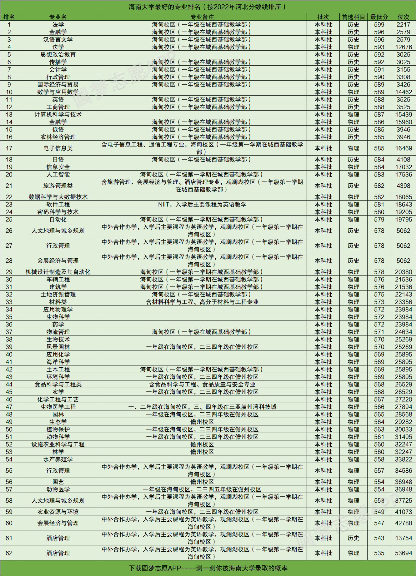 友情提醒:下载圆梦志愿APP,可查阅海南大学在你的高考省份各专业的录取分数线、位次排名。(各大手机应用市场均可下载圆梦志愿APP)