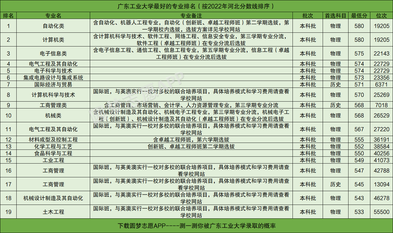 由于广东省教育考试院目前还未公布2022年的专业分,所以本文将以广东工业大学在河北2022年高考的录取情况为例,为大家展示广东工业大学最好的专业排名。