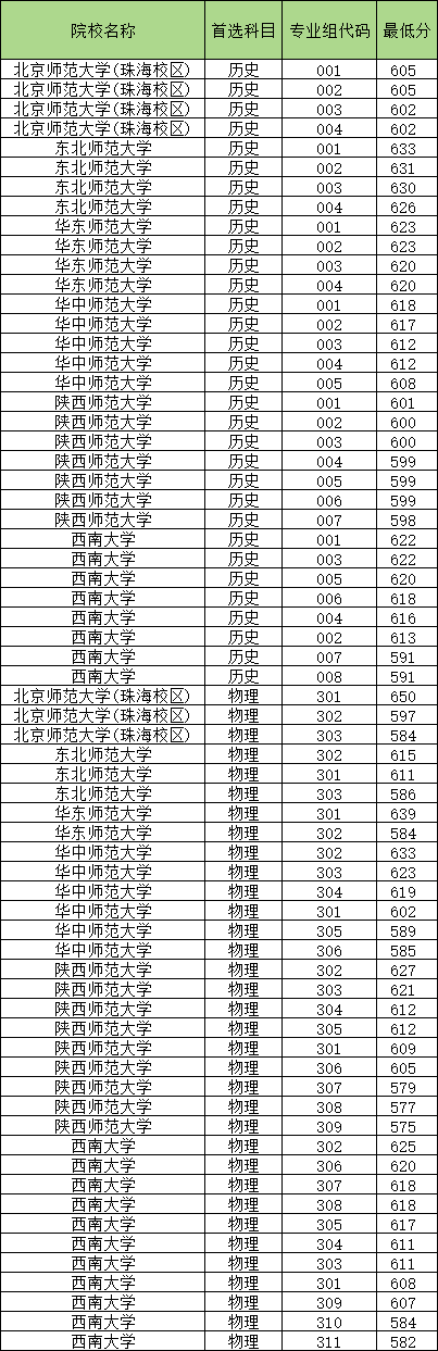 物理类最高分院校专业组为北京师范大学(珠海校区)301组(650分),最低分院校专业组为陕西师范大学309组(575分)。