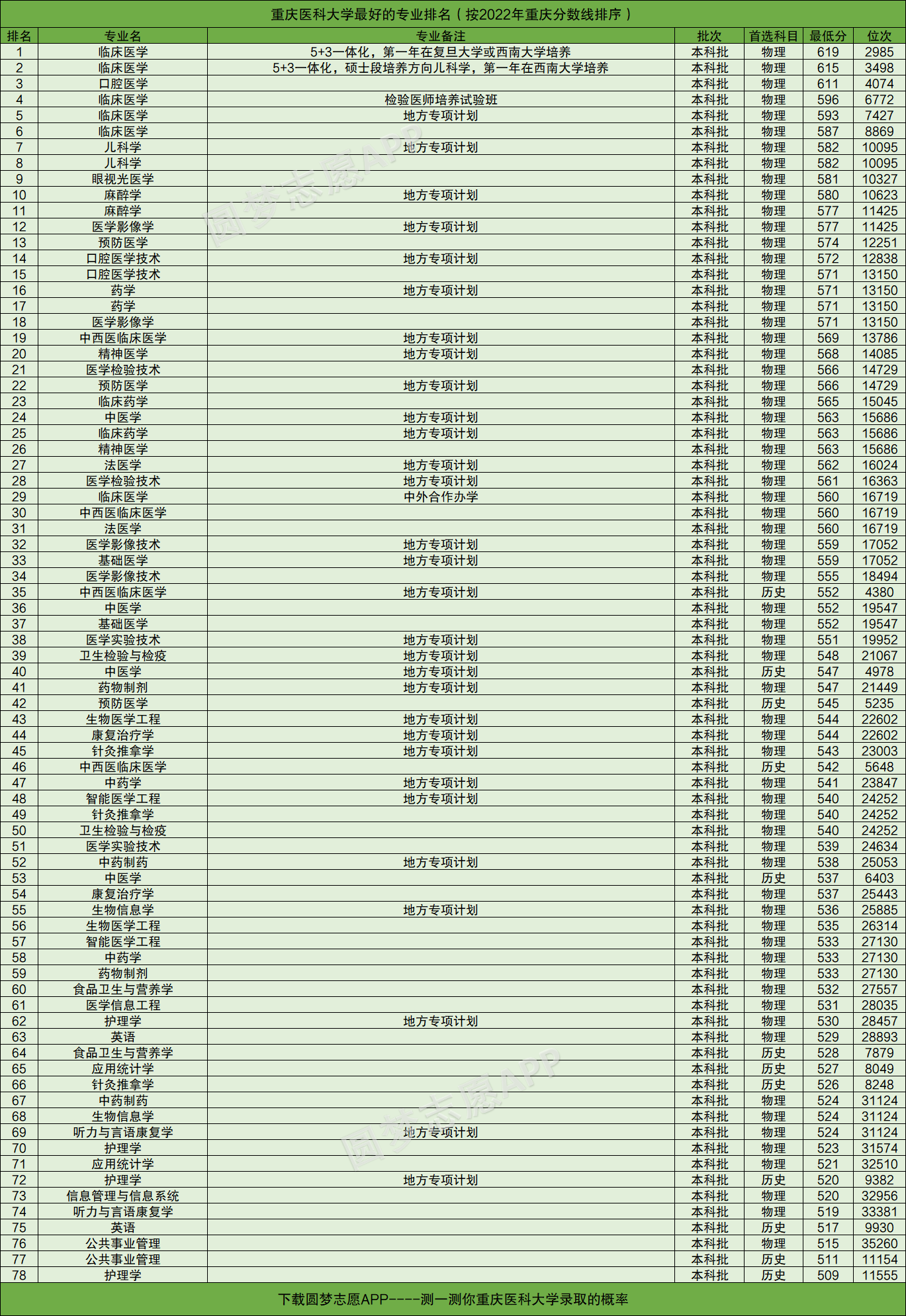 友情提醒:下载圆梦志愿APP,可查阅重庆医科大学在你的高考省份各专业的录取分数线、位次排名。(各大手机应用市场均可下载圆梦志愿APP)